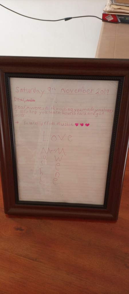 Now love has lifted me and continues to do so . You have visited me countless times and everytime you visit, you write in the visitors book and your visit in 2019 blessed me but the words you wrote made me self reflect and eventually cry. I decided to frame the words and I look at them every morning and know that Kirsten is rooting for my recovery, that is huge.