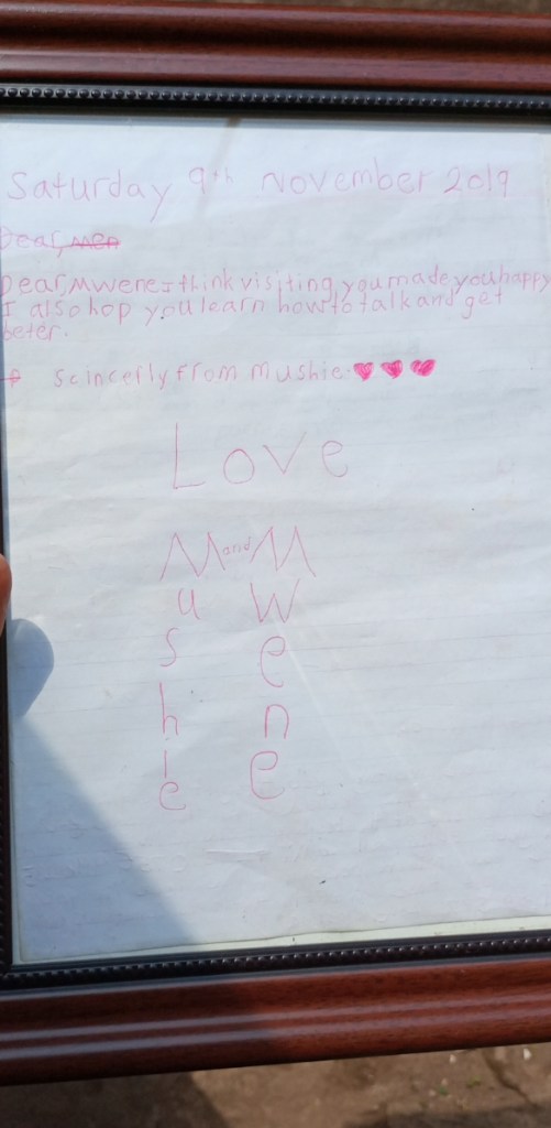 What I can say is that even for walking, we are almost there. One important thing as we begin the new week is to know that for whatever goal you want to achieve, there is a process and you have to respect that process, so is with recovery. This ofcourse will require effort and determination, there is a message that keeps me going, I framed it and read it everyday. This was written by Mushie my youngest friend and it pushes me.
