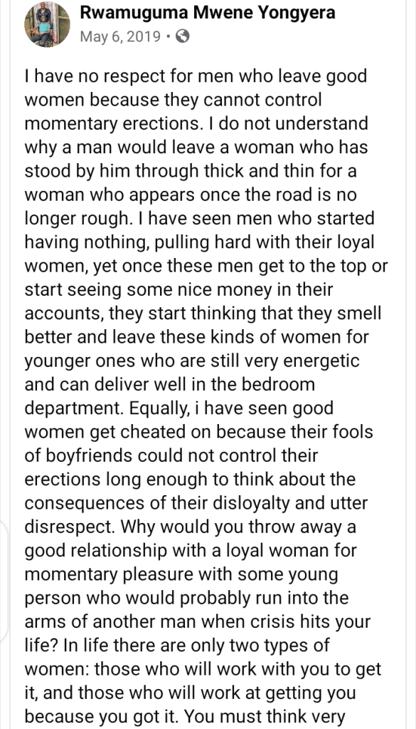 Wow. This was a good read Mwene. Addressing the elephant in the room by your Facebook post. Very necessary conversation. You gender needs to definitely do better.