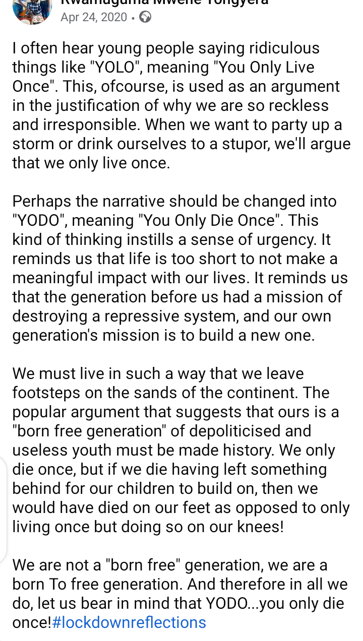 With such a mindset, I am trying to leave footsteps on the sands of Mother Africa. I know with certainty that mortality will one day call,I want those that know me to know that my duty has come to an end and make an impact on people’s lives, that is the legacy I wish to leave. Do I love life? Most definitely. I am however cognizant of the call of mortality. The only legacy that I don’t want to leave on earth is a Subaru outback.