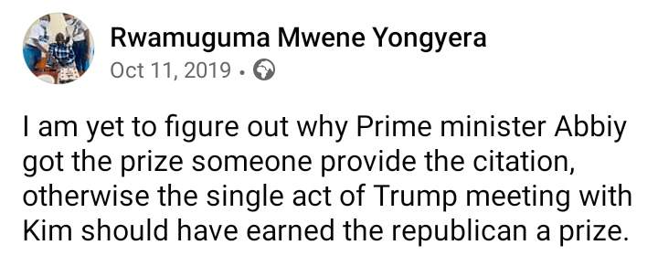 The African reality is that the Tigray Forces are matching on to the Capital, the Prime Minister has requested unarmed civilians to fight back and defeat the enemy. Some Propagandists are at it saying that Abiy has stood up to the west and he is being fought. No one however points out to the human rights abuses that both the forces have inflicted. I disagreed with the fact that the Prime Minister got a Noble Peace Prize, perhaps we should give Saddam Hussein,Ghadaffi and Hitler posthumous awards for the promotion of Human rights. The Noble Peace Prize has been given to Aung San Suu perhaps for killing Rohingya Muslims, so infact Ahmed was being thanked for killing the people of Tigray.