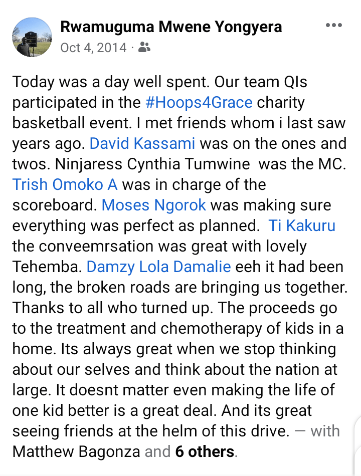 I have always believed in social entrepreneurship and identifying with good causes. In perfect health, I used to identify with 40 days over 40 smiles Foundation headed by the amazing Esther Kalenzi the causes would varry but all would be geared at supporting the vulnerable children in support of their education, learning outcome and treatment for those that can barely afford it. I attended several of the 40/40 events and I remember hoops for Grace was an event at which we registered a team to participate in a basketball tournament.