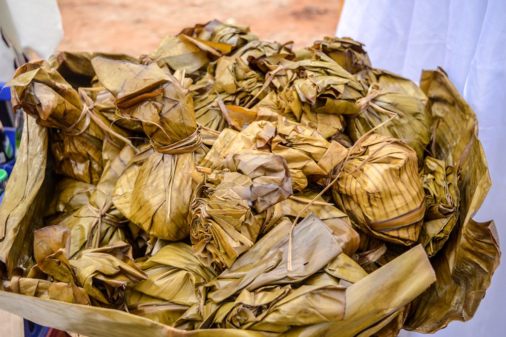 Black lines run down a gold banana leaf. A string is tied around the top ends of the leaf, like a neck tie, creating a pouch. The unknown contents of the immaculately wrapped pouch – and the accompanying aroma – raise curiosity. This is the traditional way of making luwombo, a unique mixture of sauce and a variety of ingredients enveloped in a banana leaf and then steamed over a fire for hours