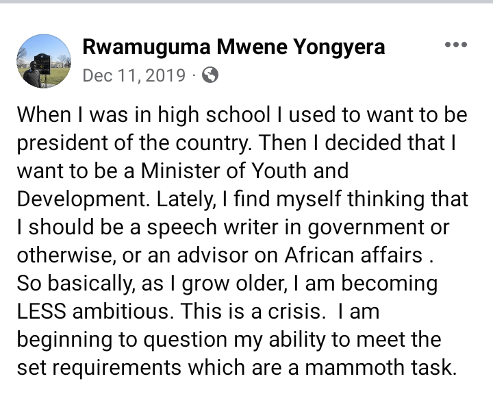 Writing for both of us has never been an issue so even after graduation we had writing and research gigs and we would cynically,”the only free money you can get is at your funeral”. This can be said to mean that the world owes you nothing! Talking aspirations, about 5 years ago, I wondered if I was on the right path because my goals seemed to be shrinking.