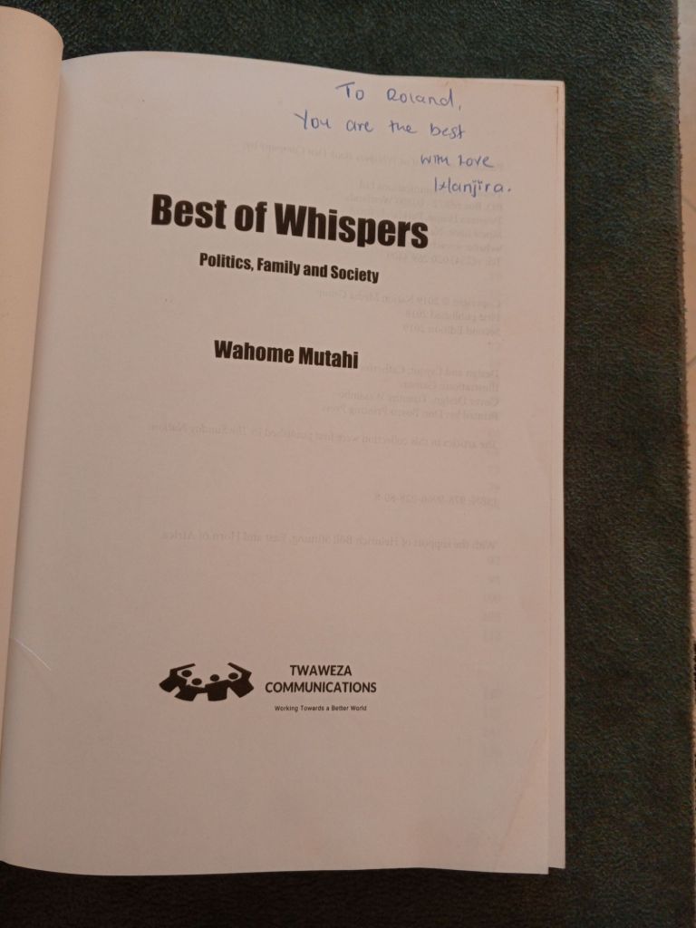 “Niaje Chief ” were my first words to her call it the icebreaker.We talked Jikoni Palatables and culinary stuff. Since I am a Pan Africanist and I gel easily with Kenyans,we talked a bit about politics and I asked about Wahome Mutahi and that was it, she knew about the humorist of the ‘whispers column’. I must add that very few Ugandans have heard of Mutahi. She told me of her readership and how the dad used to buy newspapers and she read his articles. Wow that was a good point to begin and you know what, she told me that she had a book with his collection of articles and she offered it to me.The way to my heart is a good book and the good thing is I had a friend at the time who was working in Nairobi, Kenya and so I knew that once she gave it to him,it would be as good as delivered.